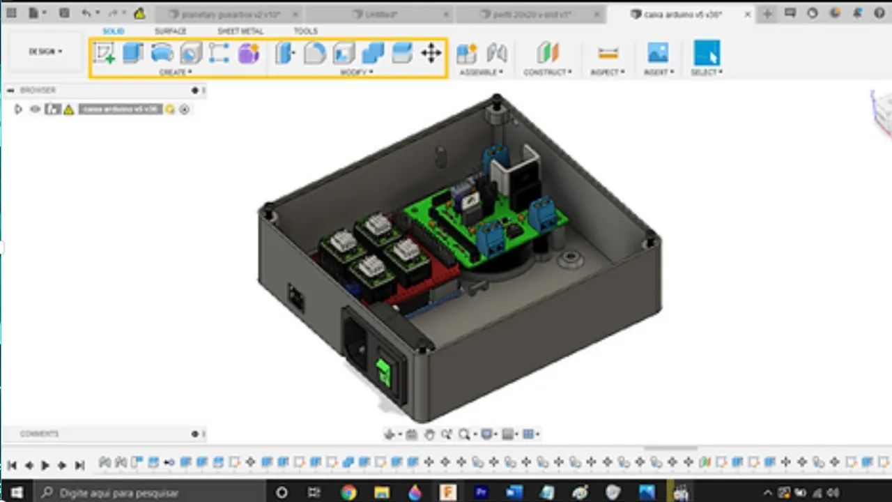 Depois de ter dominado completamente o Sketch é necessário conhecer todas as ferramentas da parte 3D em (create / modify).